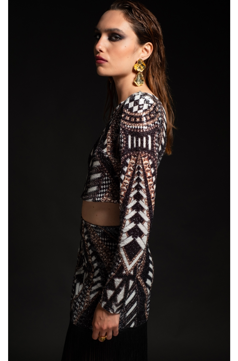Γυαλιστερές, printed παγιέτες και μια glamorous γραμμή χαρίζουν στο Abundance One Shoulder Top μας τη διάθεση του απόλυτου “I have arrived”. Συνδυάστε το με το Abundance Mini Skirt και χορέψτε μέχρι το πρωί.