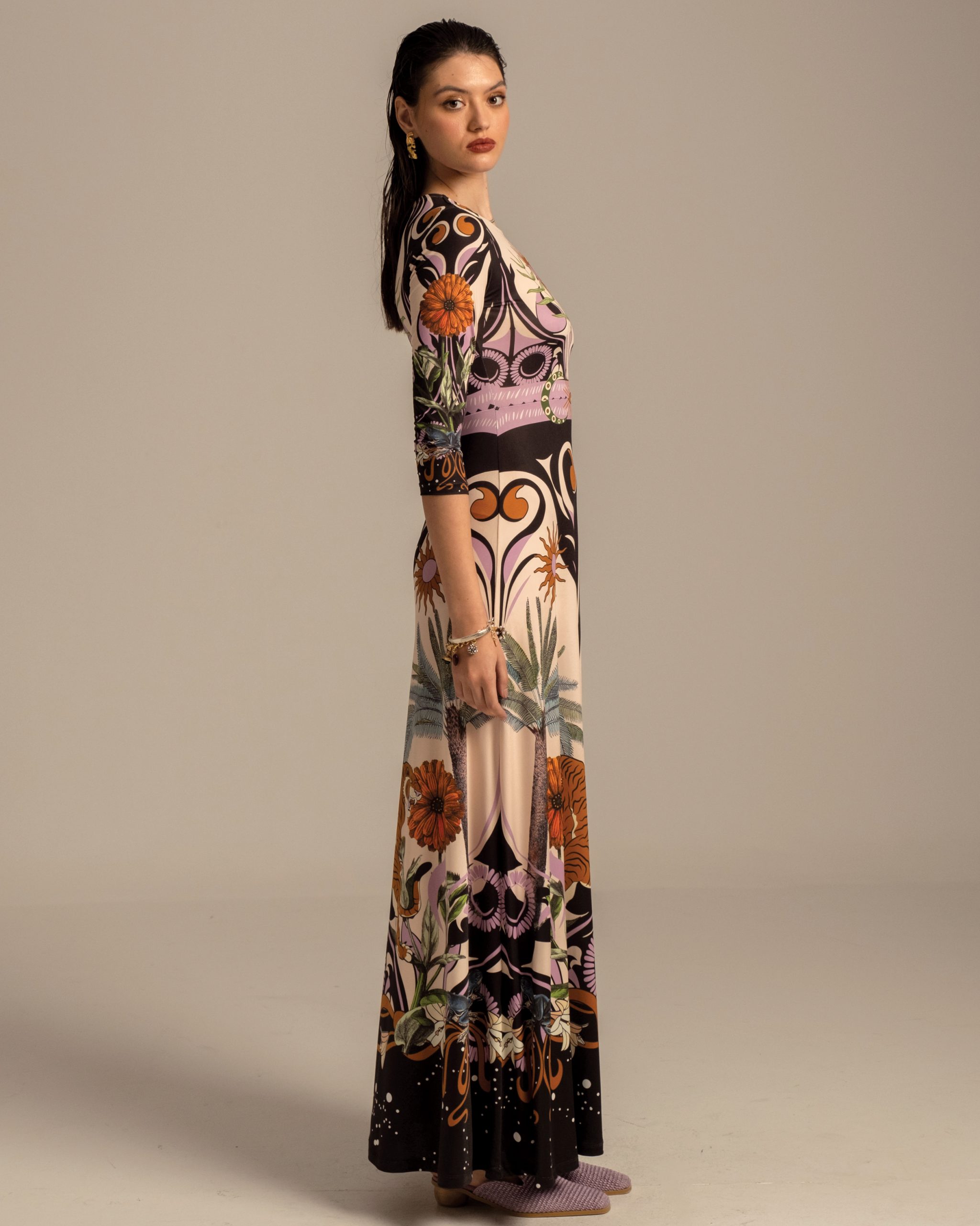 Το Ancestress Maxi Dress έχει μια διαχρονική γραμμή P+C και ένα ατμοσφαιρικό placement print που αποπνέει θηλυκότητα. Με στρογγυλή λαιμόκοψη και κομψά μανίκια 3/4, αγκαλιάζει το σώμα με το μαλακό, ελαστικό jersey ύφασμά του, ανοίγοντας σε Α γραμμή για αέρινη κίνηση. Ιδανικό για ξεχωριστές περιστάσεις!