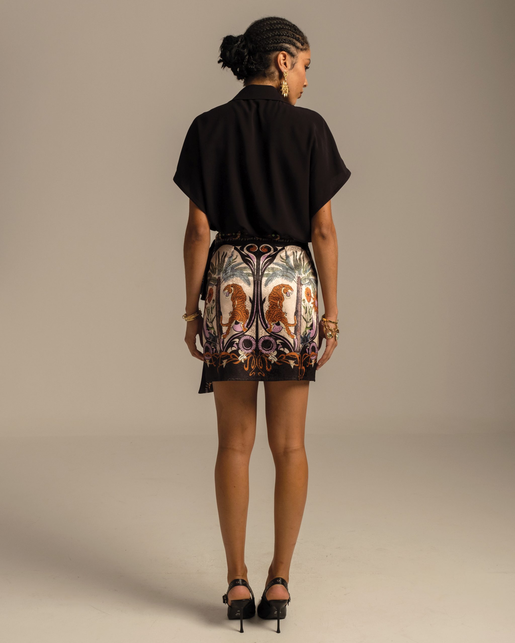 Η Ancestress Wrap Skirt είναι μια μίνι φούστα σε γραμμή Α με εντυπωσιακό print πάνω σε σατέν ζακάρ. Το ύφασμά της έχει μια διακριτική λάμψη και αγκαλιάζει όμορφα το σώμα.