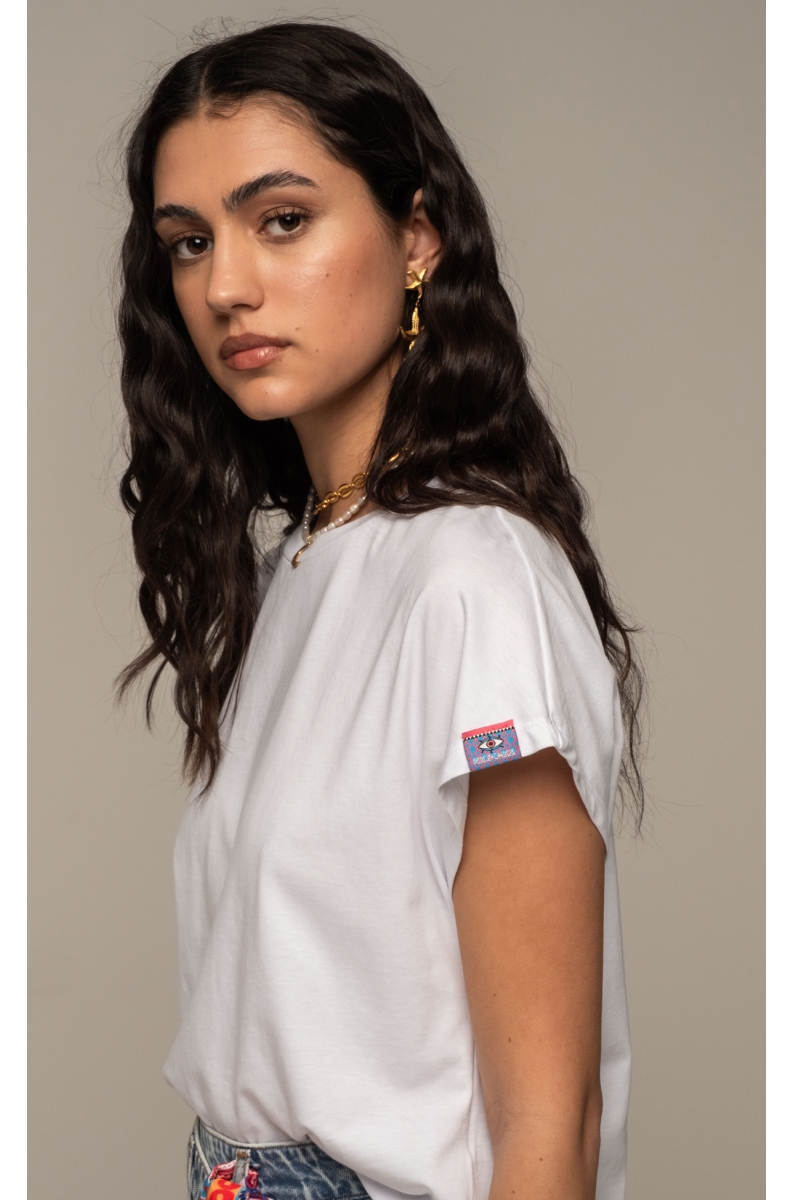 Απαραίτητο για το καλοκαίρι, το Bliss Top μπορεί να φορεθεί με όλα τα έντονα prints και τα κλασικά σχέδια της P+C. Με ριχτά μανίκια και την υφαντή ετικέτα P+C, αυτό το T-shirt είναι φτιαγμένο από μαλακό βαμβακερό jersey και διατίθεται σε μαύρο ή λευκό χρώμα.