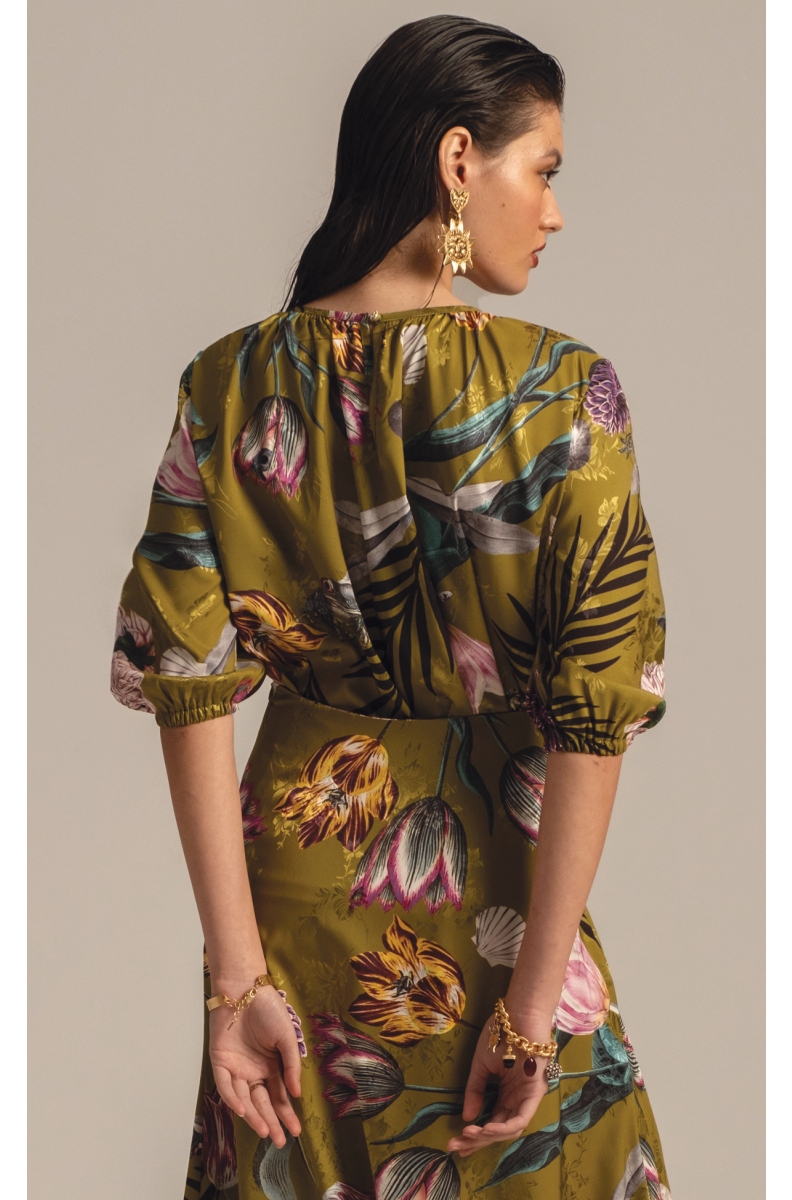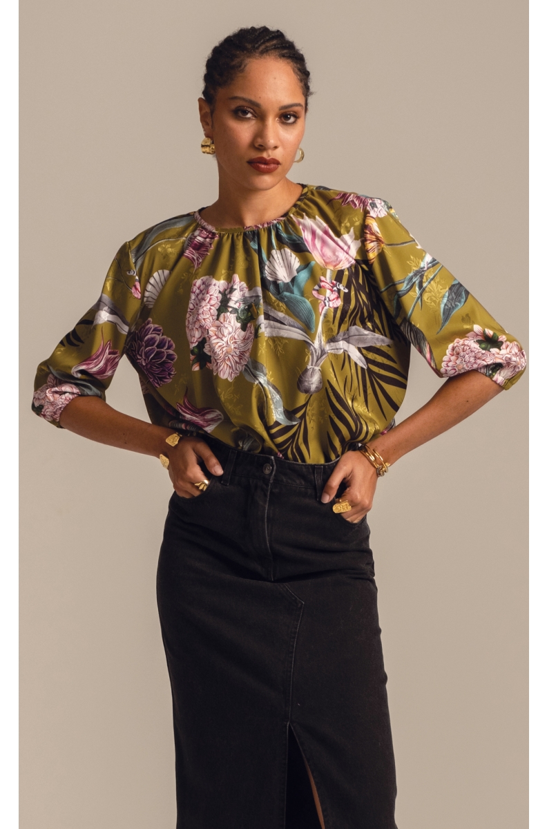 Το σατέν τοπ Dahlia, συνδυάζει λουλούδια σε παστέλ και χρυσές αποχρώσεις πάνω σε έντονο πράσινο φόντο. Το κούμπωμα στο πίσω μέρος της λαιμόκοψης καθώς και τα ¾ μανίκια του,