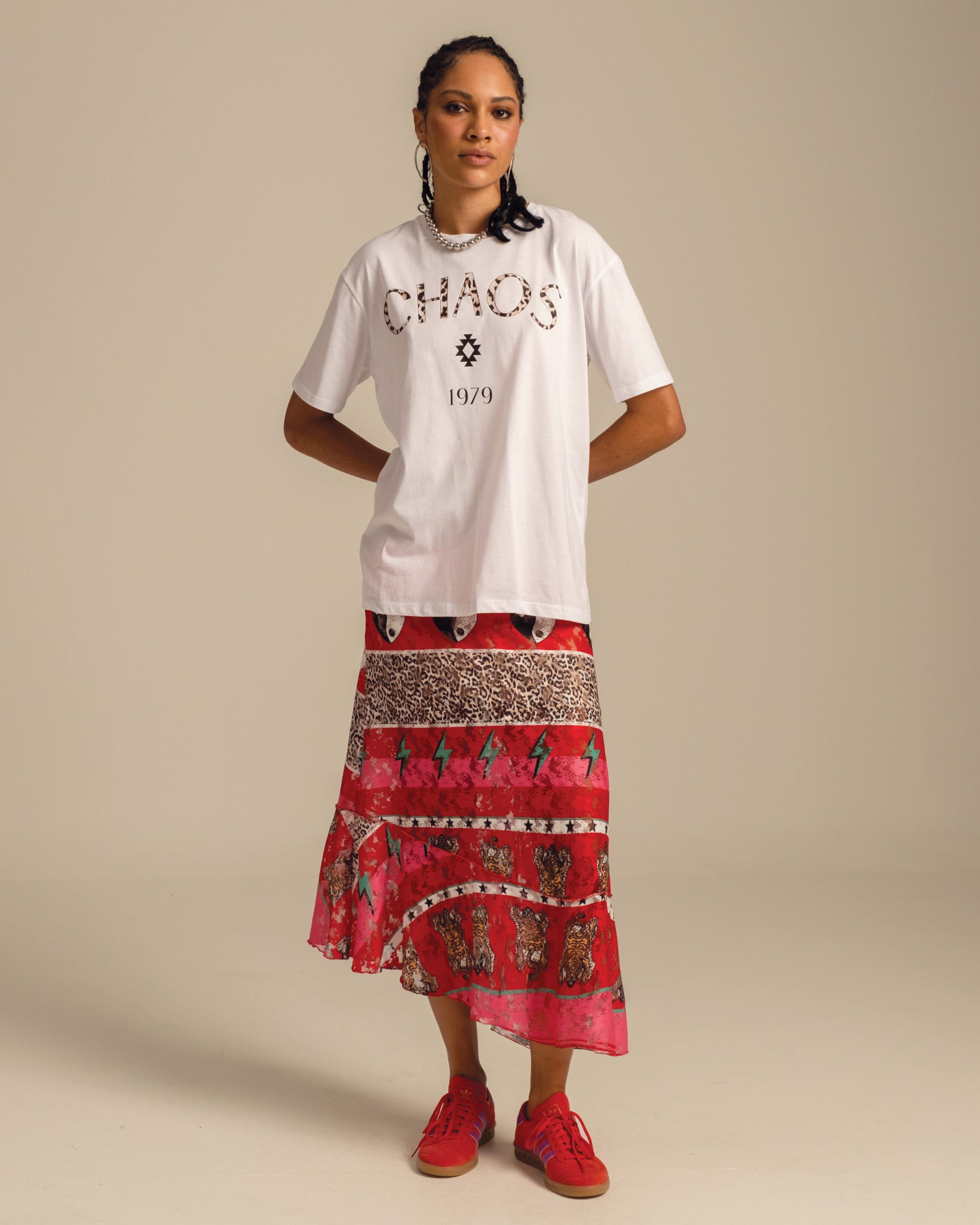 Η Equinox Lace Maxi Skirt είναι μια μακριά φούστα από ελαστική δαντέλα που συνδυάζει στο σχέδιο της σύμβολα αγάπης, δύναμης και ισορροπίας σε κόκκινο χρώμα και animal print.