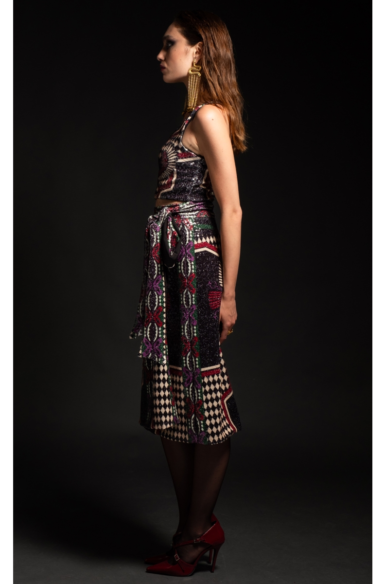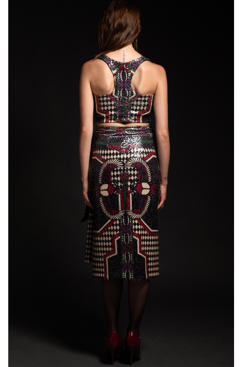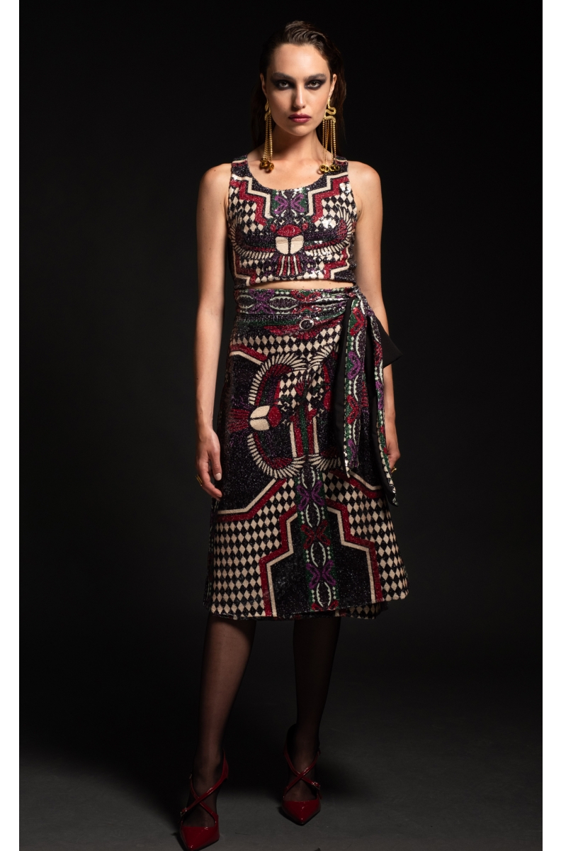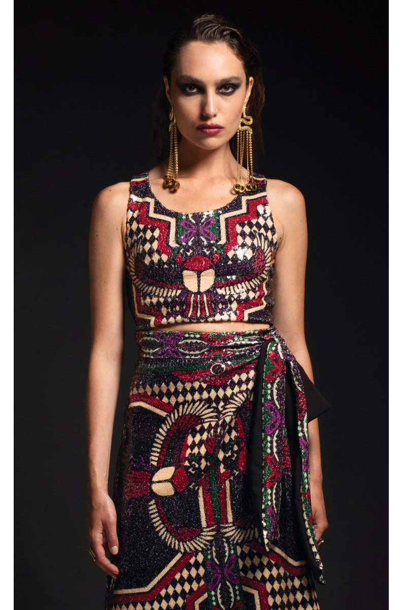 Με θεϊκό συμβολισμό και πληθώρα θεοτήτων από την αιγυπτιακή μυθολογία, το printed sequin Eternal Tank Top μας δημιουργεί μια νέα αρχή με κάθε συνδυασμό που κάνετε. Φορέστε το με το Eternal Wrap Skirt για μια έξοδο και αφήστε μια α lasting εντύπωση.