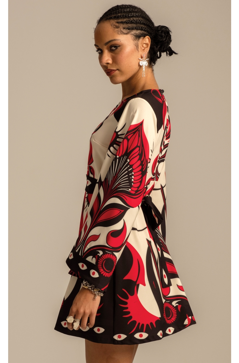 Το Lilium Short Dress ξεχωρίζει με το εντυπωσιακό του μοτίβο από λουλούδια Lilium και Venus Fly Traps, αποπνέοντας μια μποέμ και ρομαντική διάθεση. Το απαλό, ελαστικό κρεπ ύφασμα αγκαλιάζει το σώμα, ενώ η ασορτί ζώνη τονίζει τη μέση. Τα καμπάνα μανίκια και η Α-γραμμή της φούστας χαρίζουν αέρινη κίνηση, κάνοντας το φόρεμα ιδανικό για κάθε περίσταση.