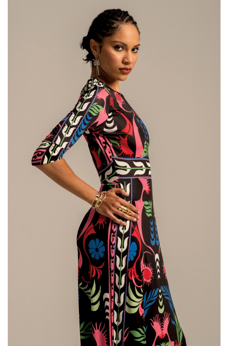 Αναδείξτε την κομψότητα σας με το Narcissus Maxi Dress. Αυτό το μακρύ φόρεμα έχει άνετη αλλά θηλυκή γραμμή, με 3/4 μανίκια που κολακεύουν τα χέρια και ελαστικό jersey ύφασμα που αγκαλιάζει τη μέση. Η φούστα σε γραμμή Α χαρίζει όμορφη κίνηση, ενώ το μοναδικό μοτίβο με σχέδια εμπνευσμένα από την φύση στο τελείωμα προσθέτει μια ιδιαίτερη πινελιά.