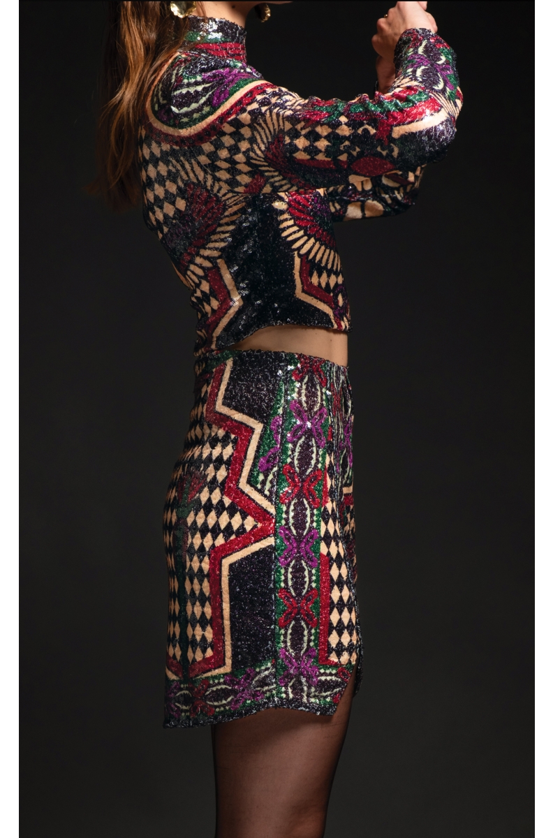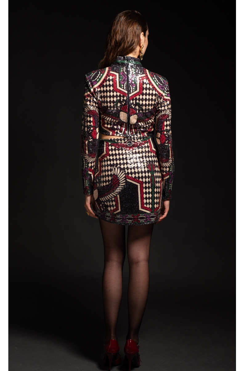 Ρευστές μίξεις πολιτισμικών στοιχείων εκφράζουν την ταυτότητά σας, ενώ η gathered γραμμή του Worship Mini Skirt αγκαλιάζει τη θηλυκότητα. Οι μαγευτικές λάμψεις του lurex αναδεικνύουν με φυσικότητα την κομψότητα των καμπύλων, κάνοντας αυτή τη mini φούστα εύκολη και ευέλικτη στην εφαρμογή. Εμπνευστείτε από το αιώνιο σύμπαν και συνδυάστε τη με το Stellar Crop Top